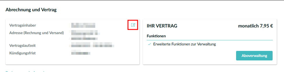 Im Benutzerprofil können Sie, über das Bearbeitungssymbol bei persönliche Daten und Vertrag bzw. Abrechnung und Vertrag die Abonnementverwaltung aufrufen.