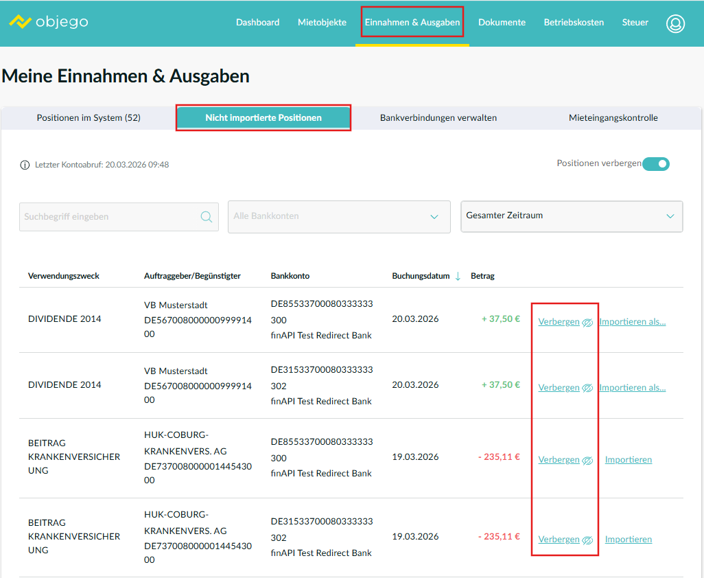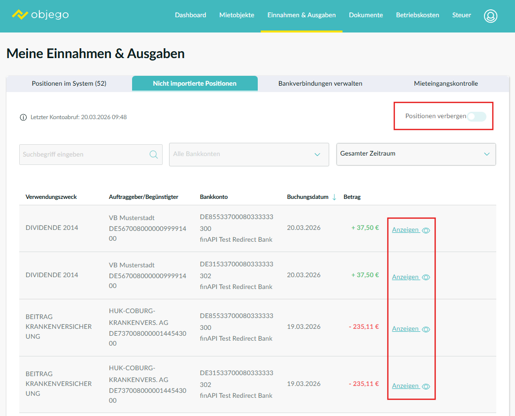 Um Positionen im Bereich: Einnahmen & Ausgaben und Nicht importierte Positionen ausblenden zu können, müssen Sie zuerst ein Bankkonto mit objego verbinden. Wie Sie Ihre Bank bzw. Bankkonten mit objego verbinden können, erfahren Sie im nachfolgenden Help Center Artikel: