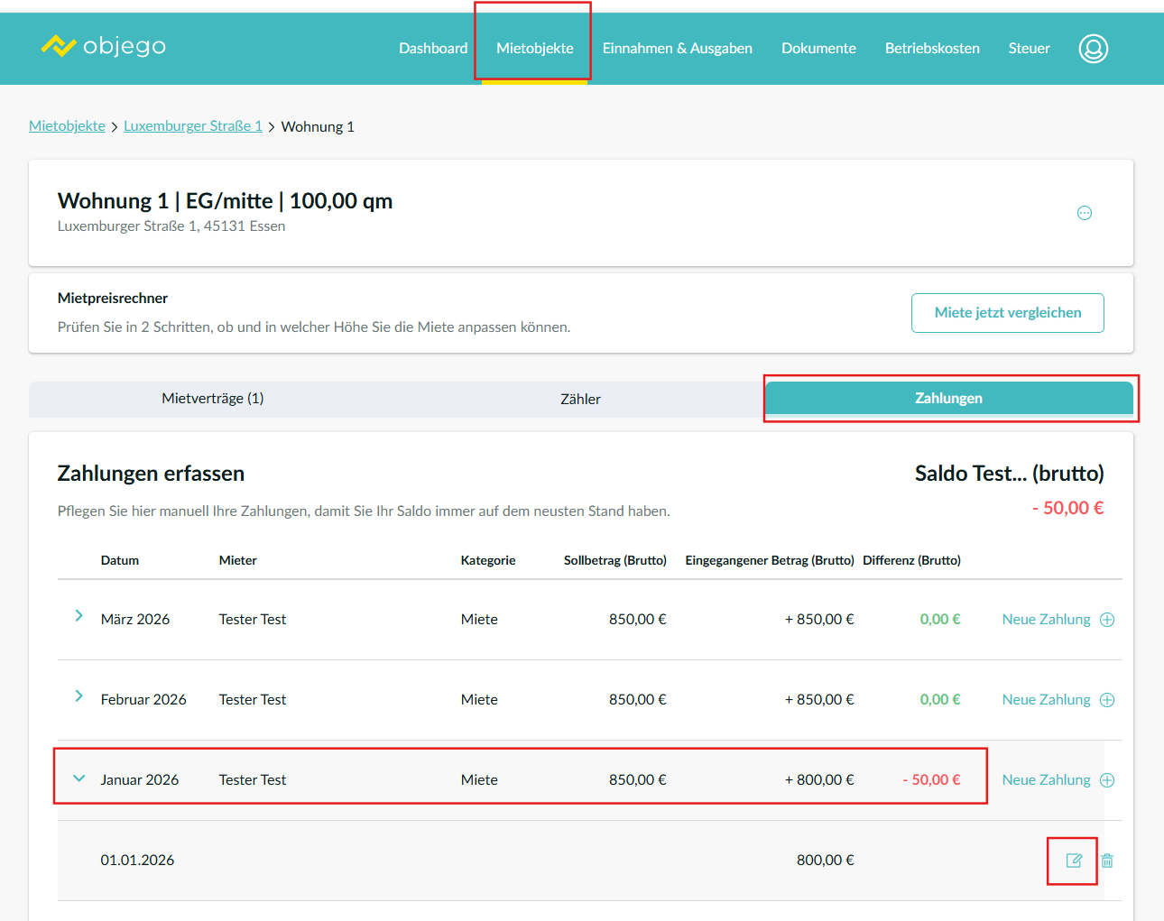 Hinweis: Bitte beachten Sie, dass diese Funktion nur bei Differenzen im negativen Bereich (Minusbeträge) zur Verfügung steht. Sollte sich aus den Änderungen ein positiver Betrag ergeben, müssen die Mietzahlungen im Bereich: Zahlungen manuell angepasst werden.