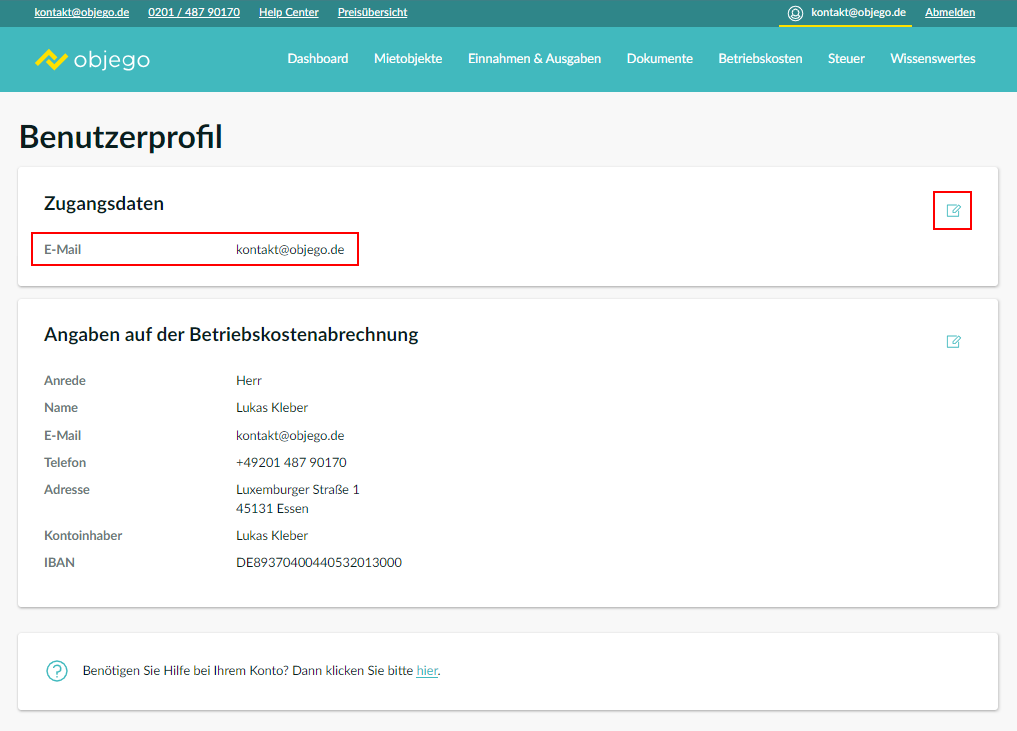 Im Benutzerprofil klicken Sie beim Punkt: Zugangsdaten, wo Ihre E-Mail-Adresse aufgeführt wird, rechts auf das Bearbeitungssymbol.