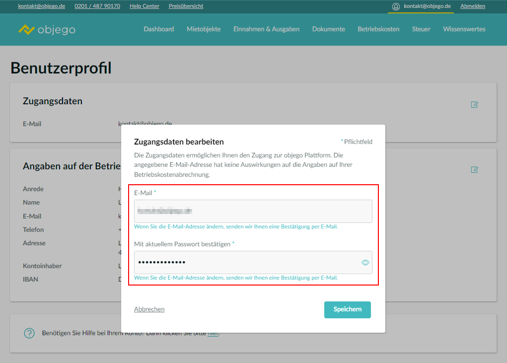 Nach erfolgreicher Bestätigung der neuen E-Mail-Adresse können Sie sich nachfolgend mit der geänderten E-Mail-Adresse und Ihrem aktuellen Passwort bei objego einloggen.