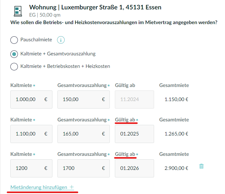 Beim Anlegen eines Mietvertrags werden Sie nach den „Monatlichen Mietbestandteilen“ gefragt. In diesem Schritt können Sie mit der Funktion „Mietänderung hinzufügen +“ zusätzliche Zeilen erstellen, um künftige Mietanpassungen zu erfassen.