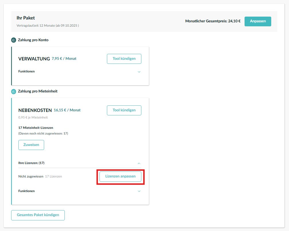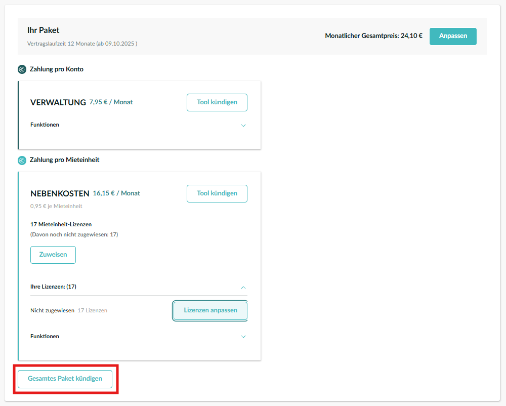Über Tool kündigen können Sie ein Zusatzpaket, wie z.B. Verwaltung und/oder Nebenkosten (mit allen gebuchten Nebenkostenlizenzen) kündigen.