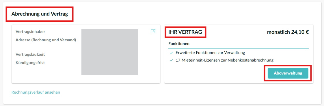 Im Benutzerprofil finden Sie Abrechnung und Vertrag und den Bereich: Ihr Vertrag mit einer Übersicht der gebuchten Vertragsdetails. Klicken Sie in diesem Bereich auf Aboverwaltung, um den Bereich aufzurufen.
