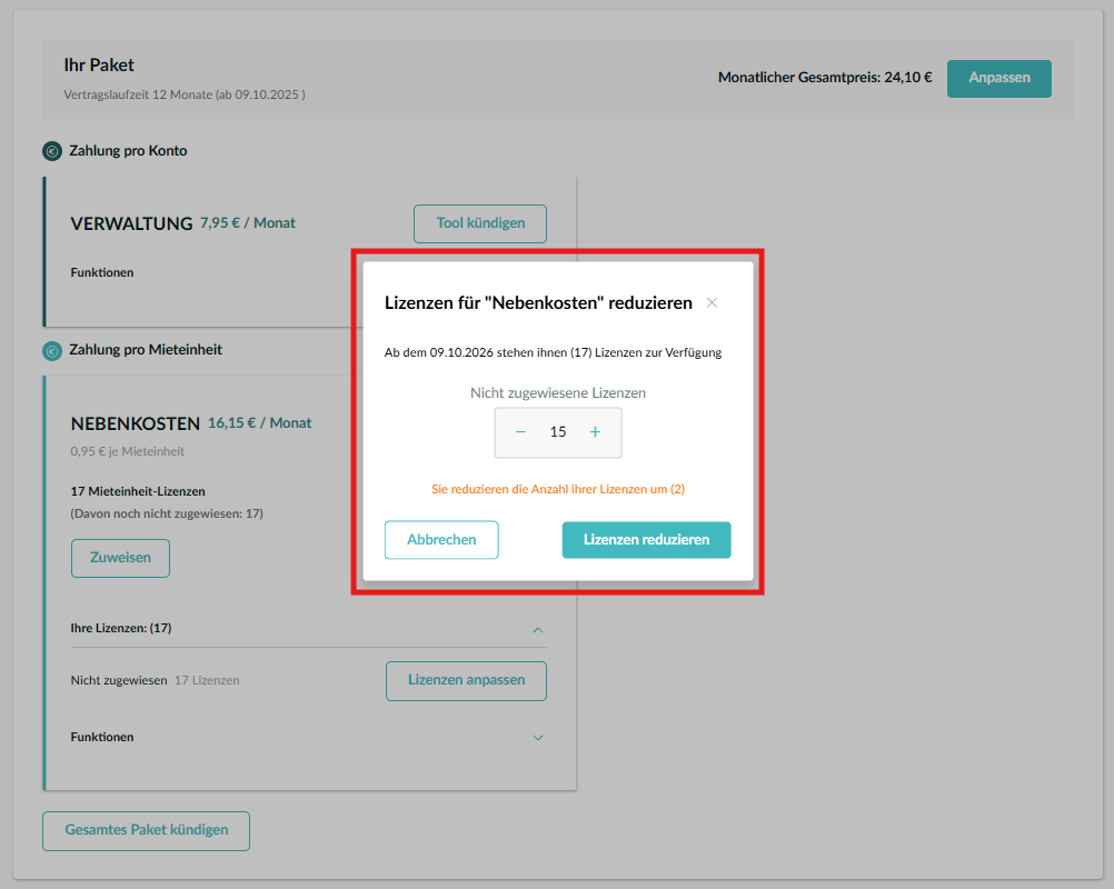 Sie haben die Möglichkeit die Anzahl der Nebenkostenlizenzen oder komplette Zusatzpakete, wie z.B. Verwaltung und/oder Nebenkosten (mit allen Nebenkostenlizenzen) zur nächsten Vertragslaufzeit zu entfernen bzw. zu kündigen.