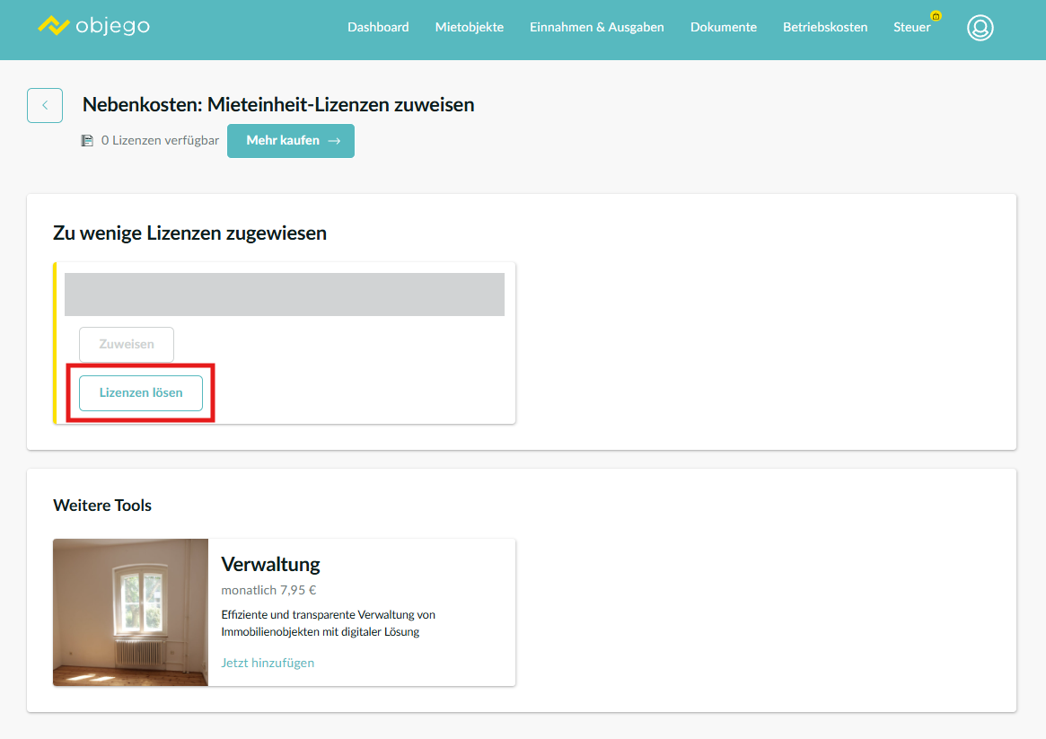Um ein Mietobjekt oder einzelne Einheiten erneut bearbeiten oder entfernen zu können, müssen zuvor die zugewiesenen Nebenkostenlizenzen gelöst werden. Dies ist notwendig, da die Einheiten durch die Lizenzbindung geschützt sind und nicht direkt gelöscht werden können.