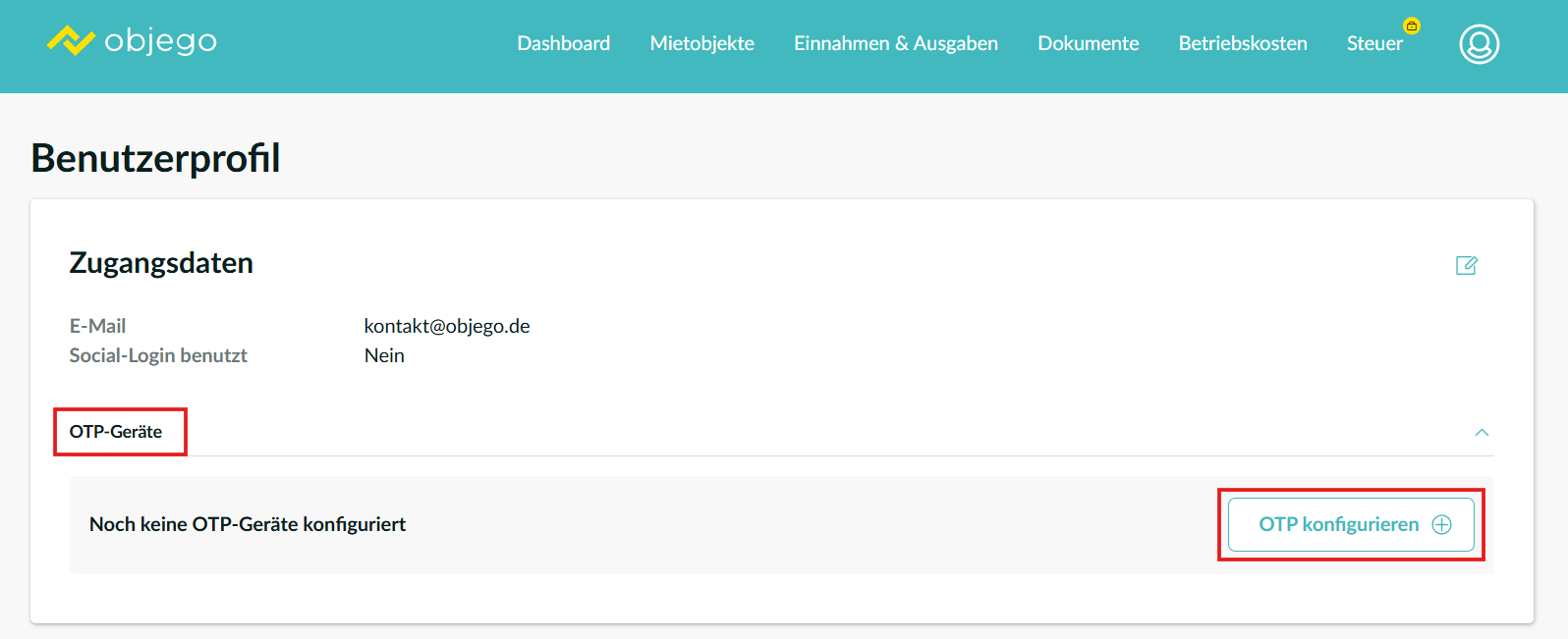 Im Benutzerprofil finden Sie den Bereich OTP-Geräte. Klicken Sie dort auf den Button „OTP konfigurieren“, um den Vorgang zu starten.