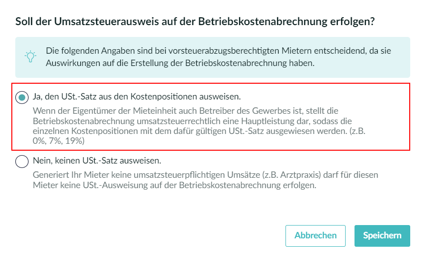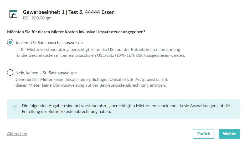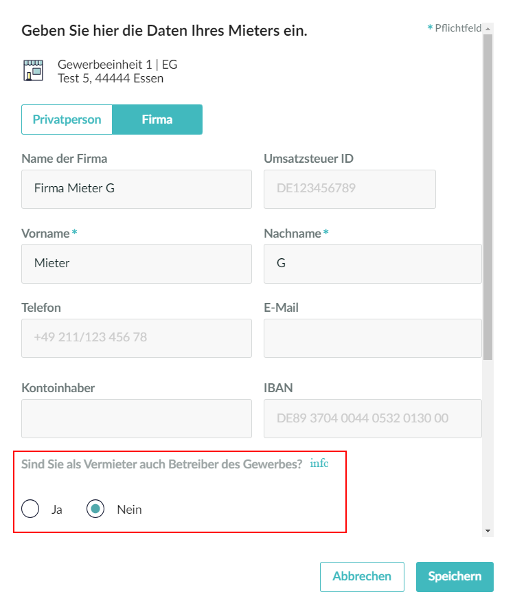 Um die USt für jede Kostenart separat auszuweisen, muss im Mietvertrag der Gewerbeeinheit, genauer in den Mieter-Angaben, bei der Option: Sind Sie als Vermieter der Betreiber des Gewerbes? "JA" ausgewählt werden.