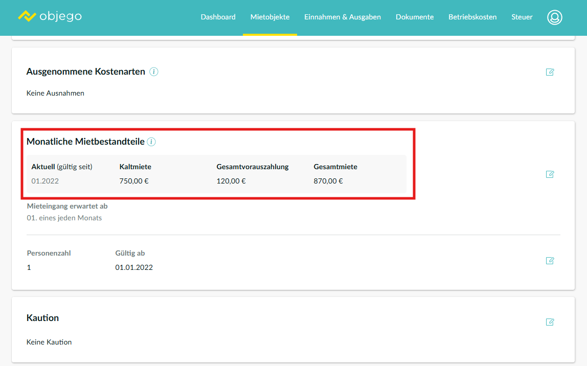 Im Bereich: Mietvertrag finden Sie den Punkt: Monatliche Mietbestandteile. Hier können Sie die erfasste Aufteilung und Beträge einsehen.