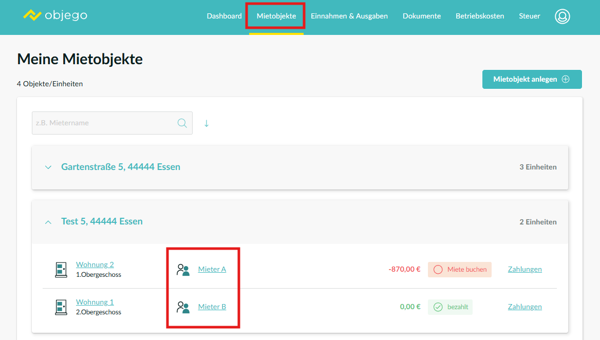 Überprüfen Sie, im ersten Schritt die monatlichen Mietbestandteile des erfassten Mietvertrags. Gehen Sie hierzu in den Bereich: Mietobjekte und klicken Sie auf den Namen des entsprechenden Mieters innerhalb des Mietobjektes.