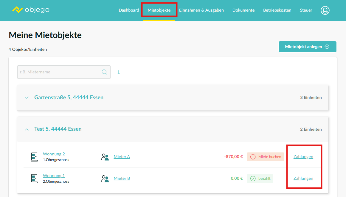 Wurde die Aufteilung und die Werte in diesem Bereich korrekt erfasst, prüfen Sie als nächstes die einzelnen erfassten Zahlungen im Bereich der Zahlungsübersicht. Hierzu gehen Sie in den Bereich: Mietobjekte und klicken, bei der betreffenden Einheit/Mieter, rechts auf Zahlungen.