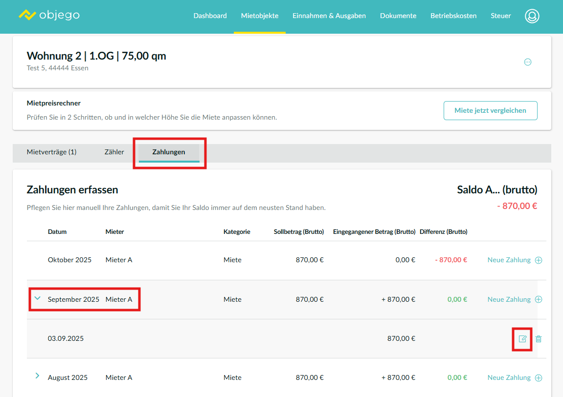 In der Zahlungsübersicht können Sie die erfassten Mietzahlungen, der einzelnen Monate einsehen und den erfassten Betrag der Vorauszahlungen einsehen, prüfen und bearbeiten.