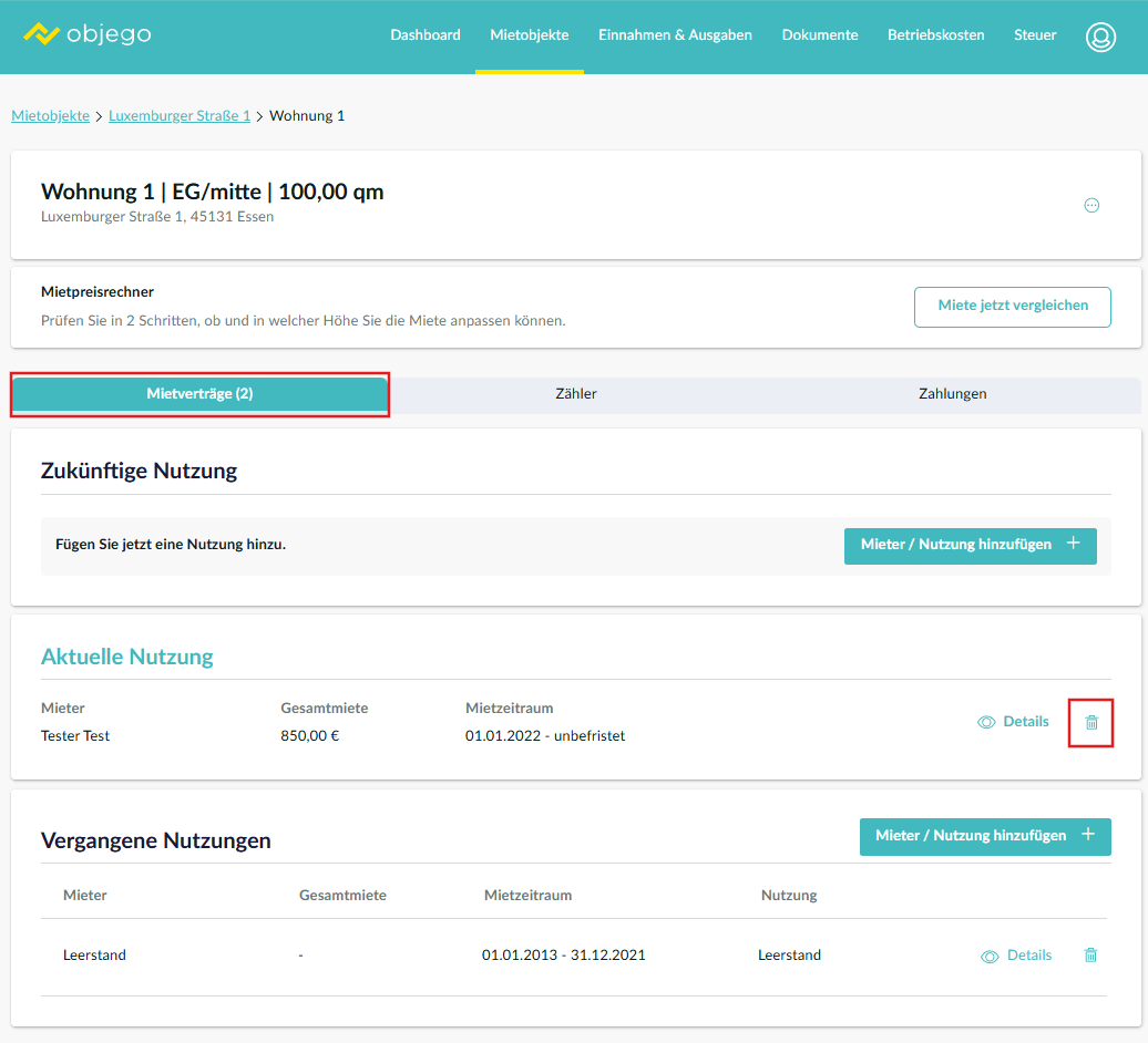 2. Erstellten Mietvertrag mit den falschen Werten neu anlegen
