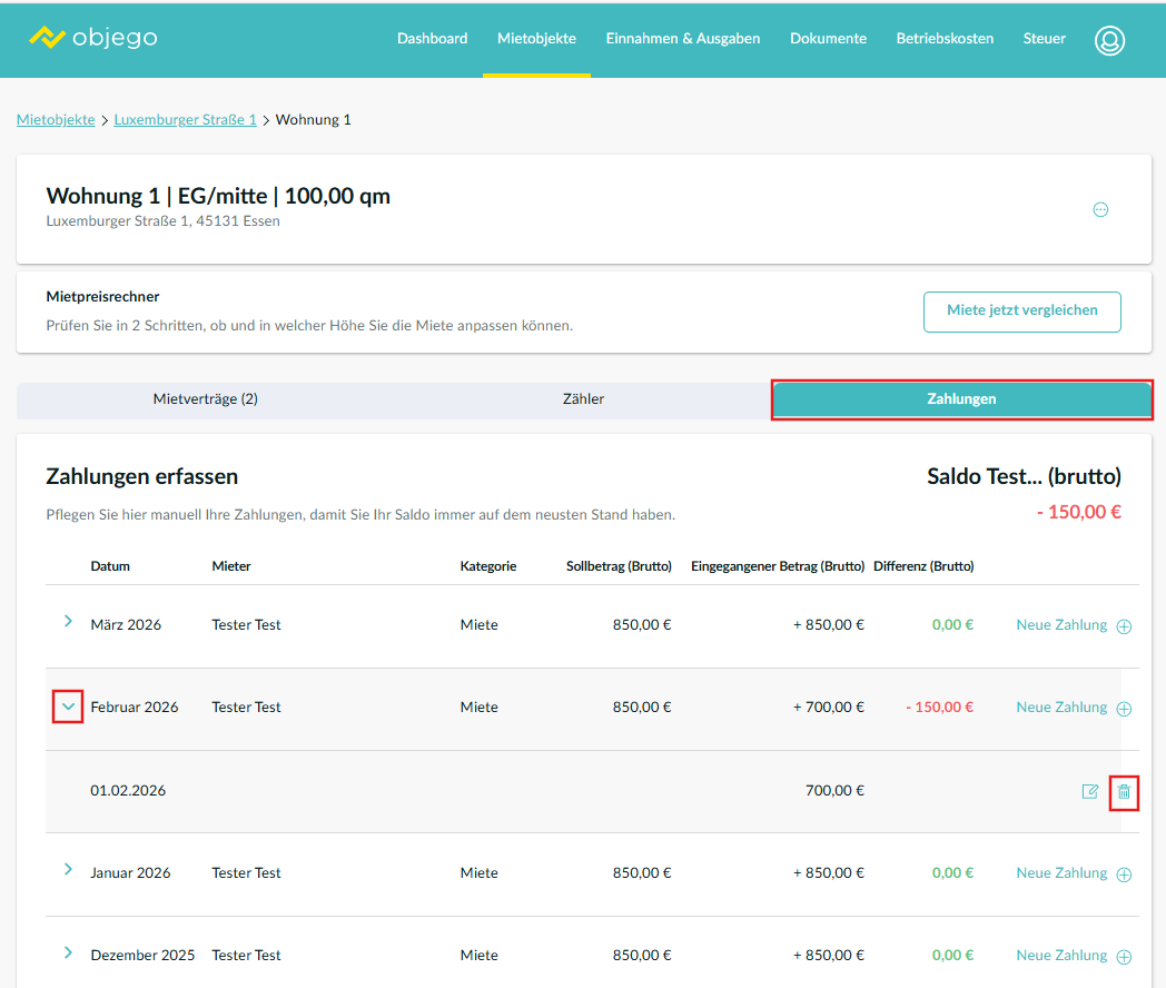 Hierbei ist zu beachten, dass die bereits rückwirkend erstellten monatlichen Zahlungseingänge nicht aktualisiert werden. Diese können im Bereich "Zahlungen Saldo" für jeden einzelnen Monat angepasst werden. Löschen Sie in der Übersicht die erhaltene Zahlung des betreffenden Monats, nutzen Sie im Anschluss „Neue Zahlung +“ und wählen Sie „Die Miete ist korrekt eingegangen“. Nachfolgend klicken Sie auf „Zahlung hinzufügen“ um dies zu bestätigen.