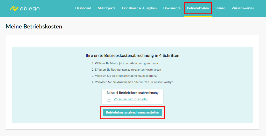 - In der Menüleiste finden Sie den Punkt „Betriebskosten“. Die Erstellung beginnen Sie mit einem Klick auf „Betriebskostenabrechnung erstellen“.