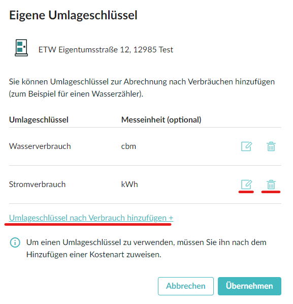 Es öffnet sich ein Fenster, in dem Sie die eigenen Umlageschlüssel mittels des Stift-Symbols: bearbeiten oder dem Papierkorb-Symbol: löschen können. Hier können Sie zudem mit der Funktion "Umlageschlüssel nach Verbrauch hinzufügen +" einen neuen oder weiteren eigene Umlageschlüssel anlegen.