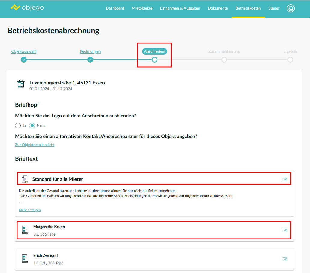 Im Vorgang der Betriebskostenabrechnung können Sie unter dem Punkt: Anschreiben eine Textvorlage für alle Mieter oder einen persönlichen Text für ausgewählte Mieter erstellen. Des Weiteren können Sie einen alternativen Kontakt/Ansprechpartner für das ausgewählte Objekt anlegen, hierzu werden Sie über den Link: "Zur Objektdetailansicht" in den Bereich Mietobjekte geleitet. Als weitere Funktion im Bereich Anschreiben können Sie das objego Logo, nach Wunsch auf dem Anschreiben der Betriebskostenabrechnung ausblenden.