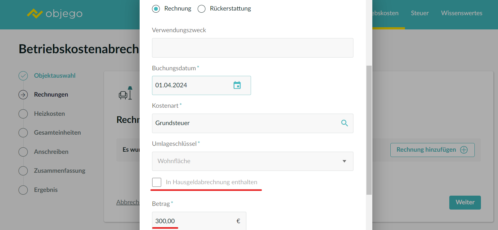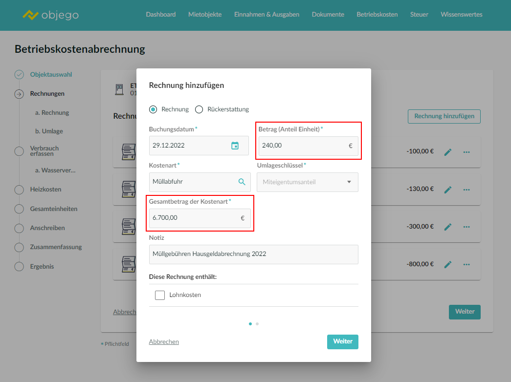 Eigentumswohnung(en) werden in objego als separates Objekt behandelt und unabhängig von den anderen Einheiten innerhalb des Objekts abgerechnet. Wenn Sie zwei Eigentumswohnungen innerhalb eines Mietobjekts haben, müssen die Kosten separat für die einzelnen Eigentumswohnungen eingetragen werden.