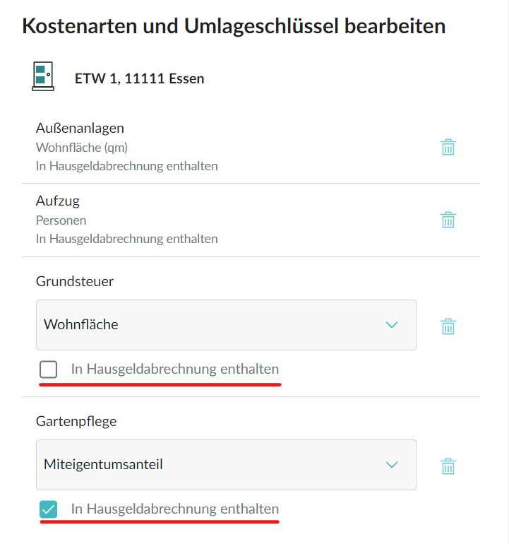 Die meisten Kostenarten sollten Sie der Hausgeldabrechnung entnehmen können. Achten Sie hierbei darauf, dass Sie nur die umlagefähigen Kosten aus der Hausgeldabrechnung entnehmen. Setzen Sie bei den entsprechenden Kostenarten den Haken bei Hausgeldabrechnung. Die Rechnung für die Grundsteuer wird zum Beispiel nicht auf der Hausgeldabrechnung aufgeführt, da Sie die Rechnung als Eigentümer direkt erhalten. Hierfür können Sie den Haken entfernen.